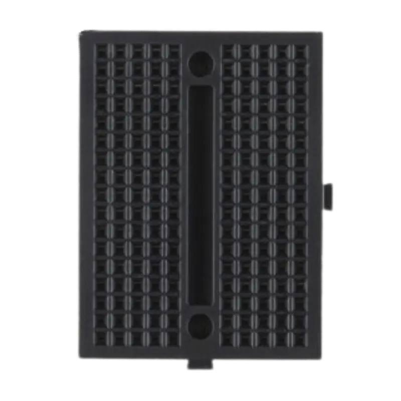 The black 170-point mini breadboard is the go-to choice for makers who want their projects to look professional and “stealthy.” This board is identical in function to standard breadboards but comes in a deep black finish that hides shadows and makes your components pop. It features 17 columns of 5-point rows and a center notch for IC mounting. Its compact footprint is ideal for wearable tech and small IoT devices.