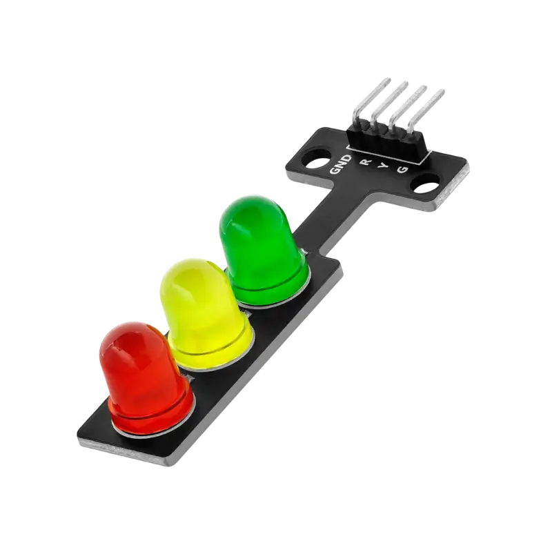 “The Traffic Light Module is a simple yet effective way to learn about digital outputs and timing. It integrates three 8mm LEDs (Red, Yellow, Green) on a single PCB, eliminating the need for a breadboard or complicated wiring with resistors, as they are already built-in.